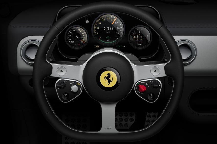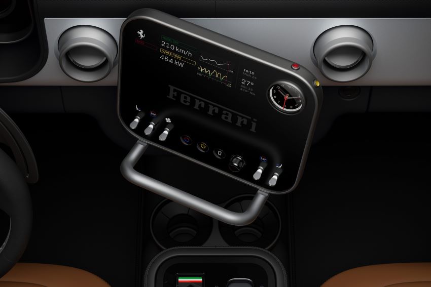 Nas fotos apresentadas pela marca italiana, a cabine segue um padrão minimalista, que busca fazer referência aos antigos modelos da marca dos anos 1970. De acordo com a Ferrari, cada elemento foi projetado para ser funcional, intuitivo e emocionante de dirigir.
