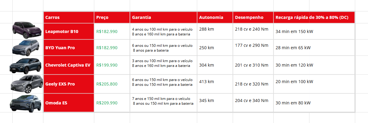 BYD Yuan Pro, Leapmotor B10, Omoda E5, Chevrolet Captiva EV e Geely EX5 Pro foram analisados em preço, garantia, autonomia, desempenho e recarga rápida. O objetivo é colocar as informações de ambos lado a lado, para você definir qual combina mais com a sua rotina e seu estilo de condução. Confira os detalhes abaixo, ou também no Youtube do Canal VE.